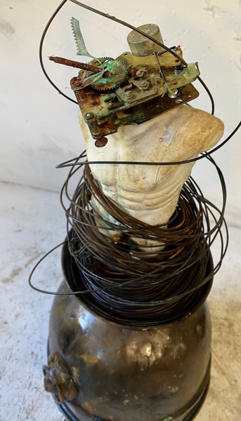 Wire, Mixed Media on Dumpster Concrete Statue, Rusted Electrical Socket